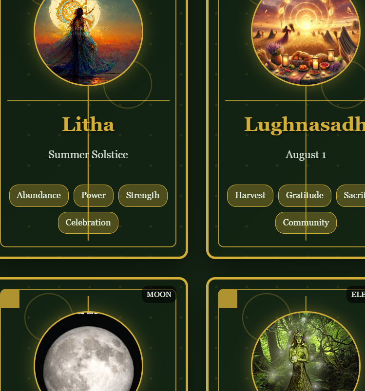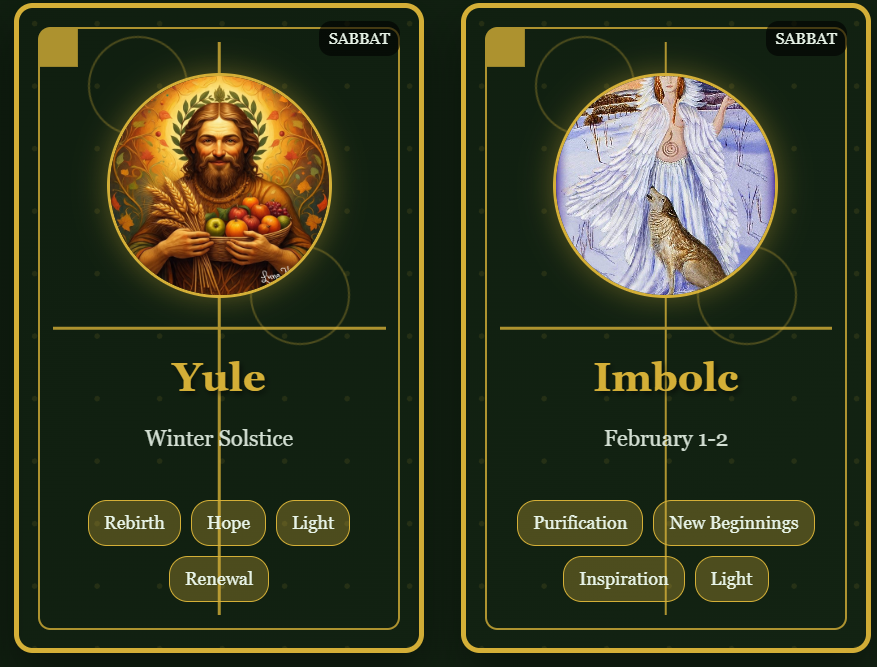 • 8 Wheel of the Year Sabbats (Samhain, Yule, Imbolc, Ostara, Beltane, Litha, Lughnasadh, Mabon)