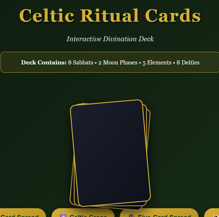 A beautiful 23-card digital deck for Celtic spirituality, Wheel of the Year celebrations, and modern pagan practice. Includes interactive web app