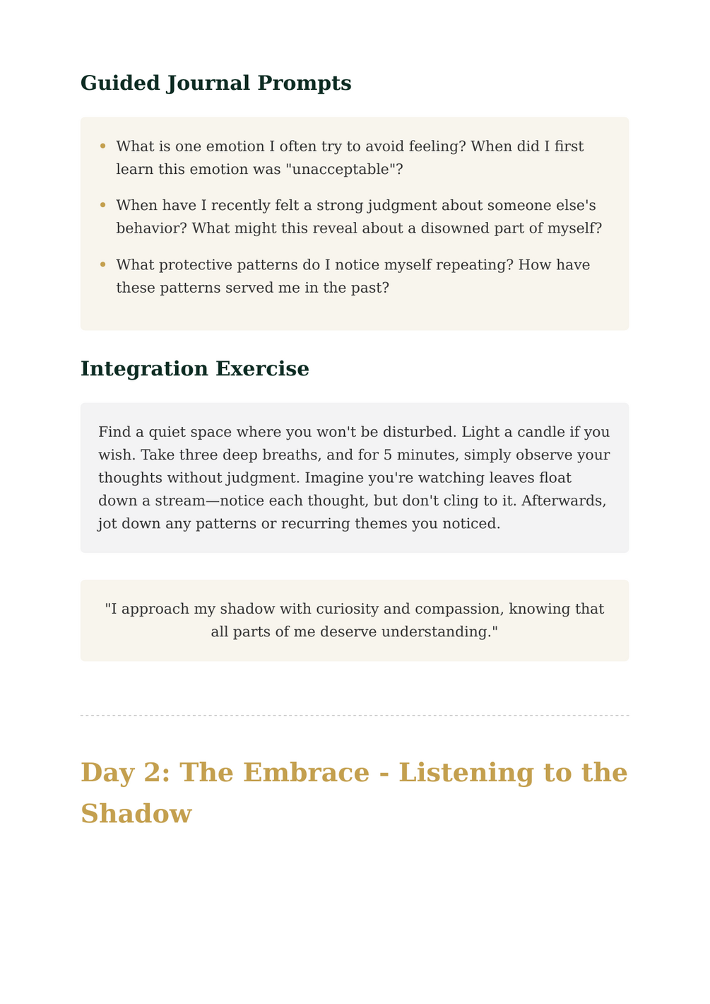 Day 1: The Mirror (Noticing the Shadow) - Learn to identify your shadow aspects with curiosity Day 2: The Embrace (Listening to the Shadow) - Practice compassionate understanding of your hidden parts