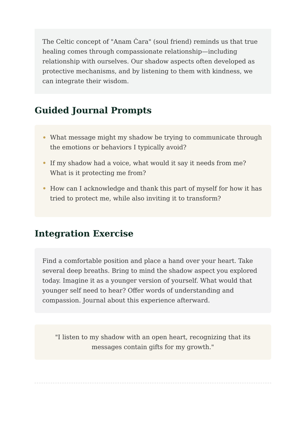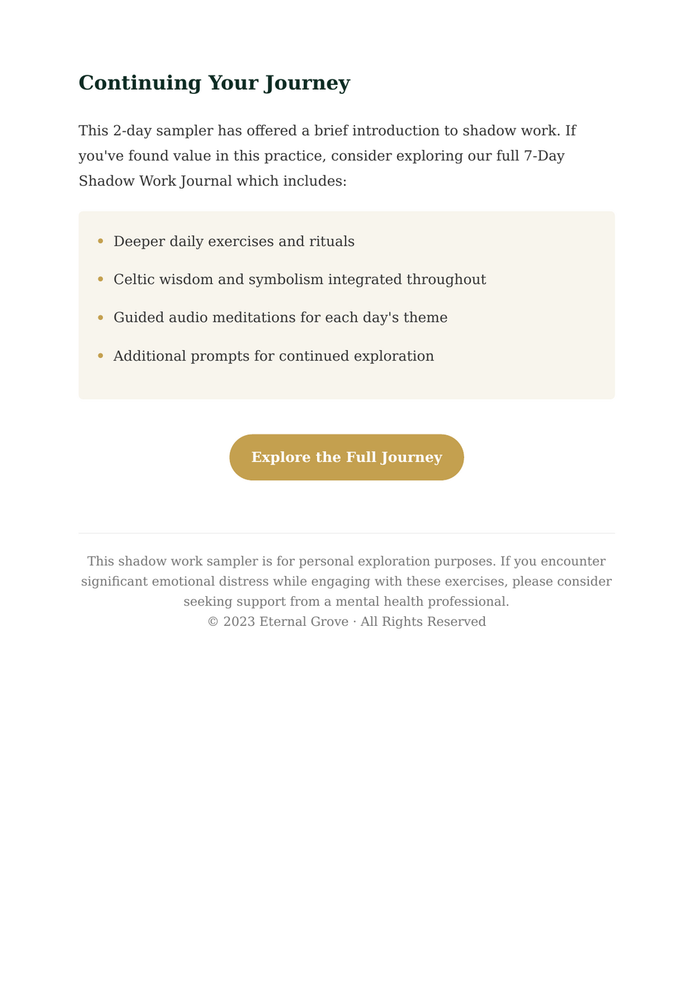 Over two guided days, you'll engage in reflective journaling and simple exercises designed to help you notice and compassionately understand the parts of yourself you typically avoid. Each day includes thought-provoking prompts, integration exercises, and affirmations rooted in Celtic tradition.